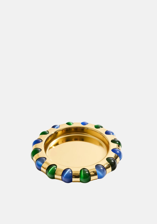 Sleek. Stunning. Brass and Glass. A gold-toned tray, molded around jumbo marbles in brilliant blue and deep green. Perfect dish for displaying jewelry, keys, perfumes, or serving drinks in style.