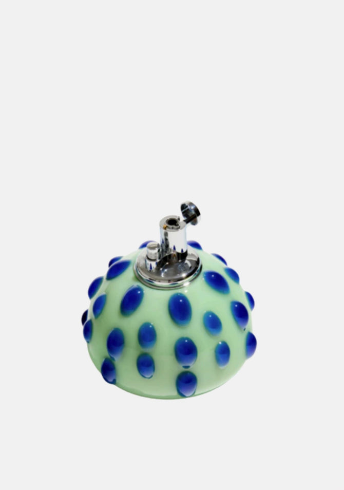 Add a pop of playful glamour to your home with Edie Parker’s Spotted Glass Tabletop Lighter. Handcrafted in vibrant green glass adorned with bold cobalt blue spots, this sculptural piece doubles as a functional lighter and a dazzling conversation starter.