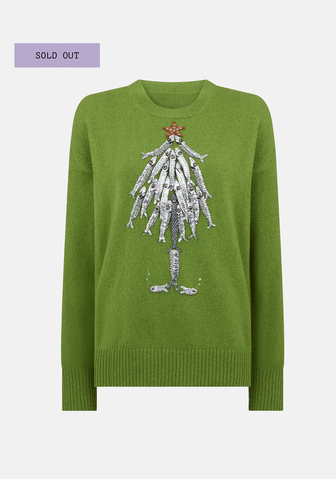 Deck the halls (and your wardrobe) with this sparkling Fishmas Tree jumper. Hand-knitted sardines shimmer across the front, forming a festive fir that turns cosy knitwear into wearable art.