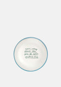 A ceramic plate with a clean blue rim and a hand-painted message: “never worry about the size of your Christmas tree.” A thoughtful and understated design that adds a touch of personality to the holiday table.