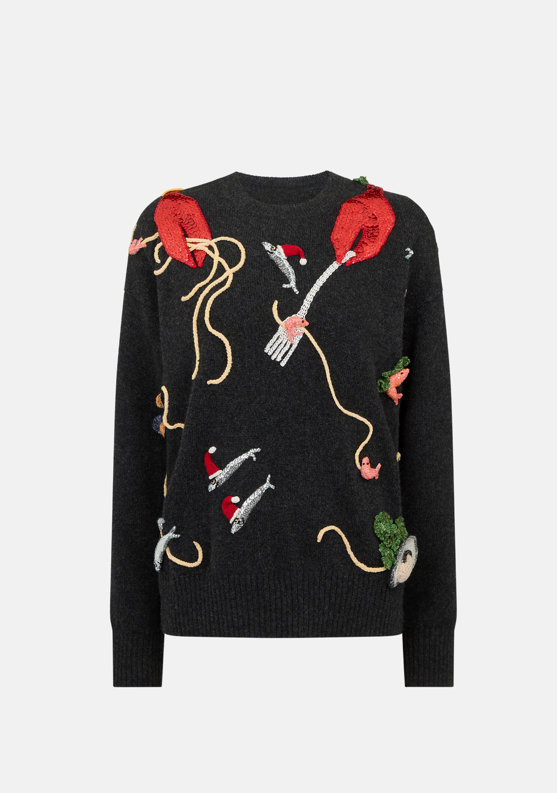 This slouchy crewneck features sequined lobster claws tucking into sardines and spaghetti - because who says dinner can't be wearable? Soft, relaxed, and full of personality, it's wearable art that turns cosy layering into a conversation-starting statement.