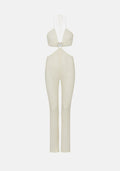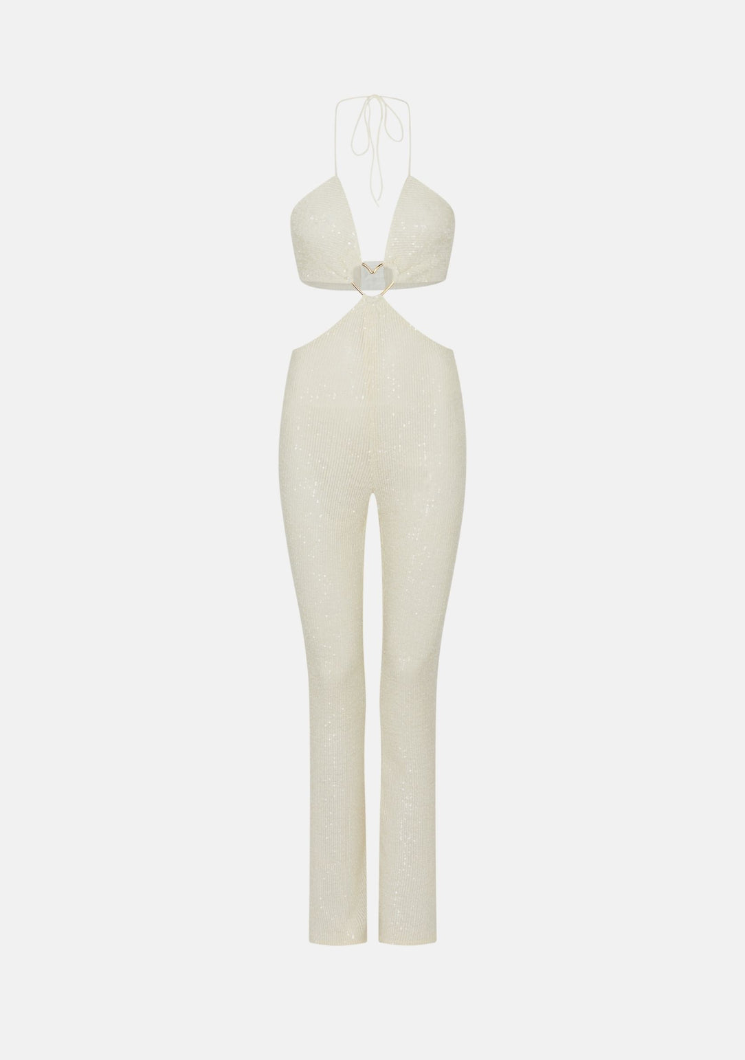 Made from a glistening jersey fabric that hugs the body in all the right places, this glamorous Ursula jumpsuit from NERVI will sparkle as you groove. One for the disco divas, the skin-baring design is finished with a plunge neckline, halterneck straps and gold-tone metal heart detail.