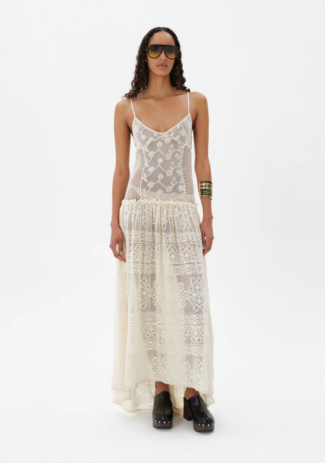 The Constanza Dress is an ethereal expression of romantic elegance. Cut from delicate lace and knit panels, it features a softly flared silhouette with sequin embellishments and subtle ruffles at the waist. With its spaghetti straps and sweeping hem, it's perfect for summer events or dressing up on holiday evenings.