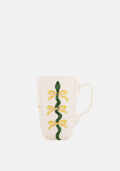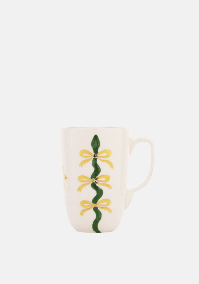Hand-painted ribbons and bows wrap this tall ceramic mug, turning everyday coffee into a joyful ritual. Bright, fun, and unmistakably Gunia.