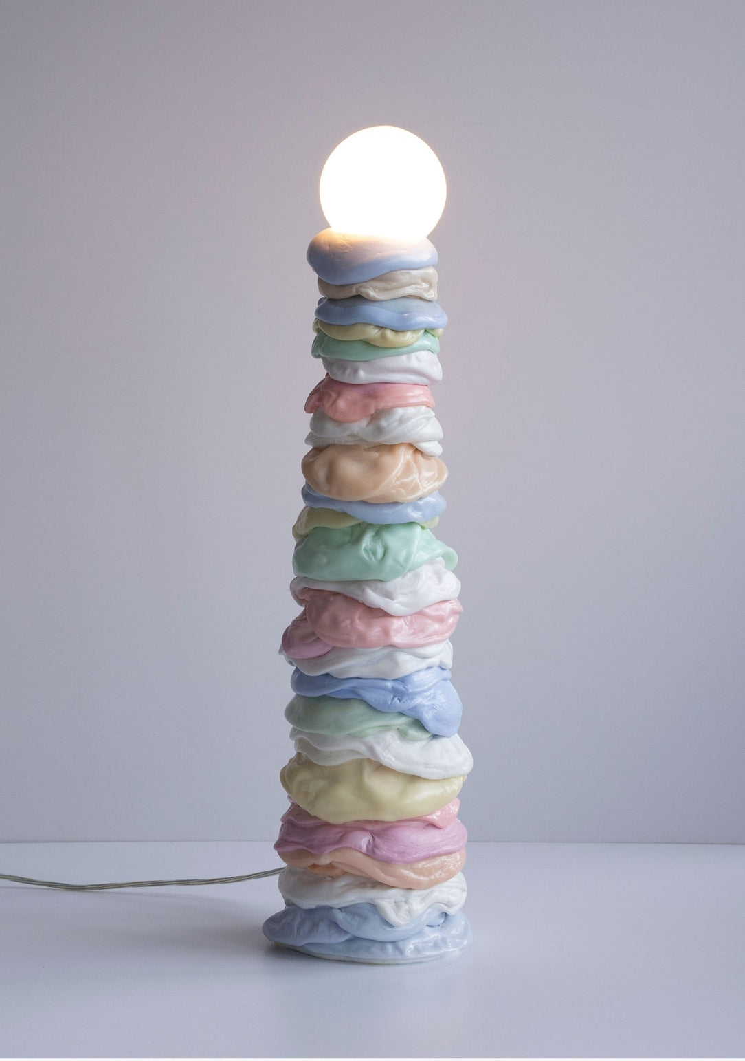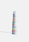 Bring playful artistry into your space with the Tall Blob Lamp, a sculptural lighting piece by James Shaw. Stacked with brightly colored, blob-like ceramic forms, each layer is glazed in glossy pastels, creating a joyful and tactile texture. The orb-shaped bulb atop emits a soft, warm glow, perfect as a statement piece in any room. Each lamp is handmade, meaning no two are exactly alike. A unique blend of whimsical design and thoughtful craftsmanship.