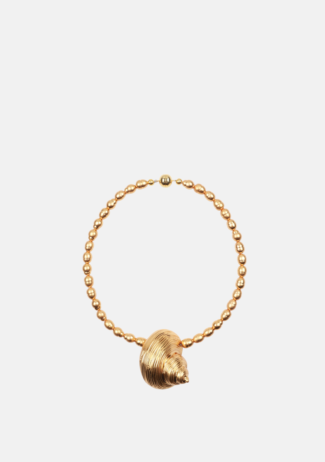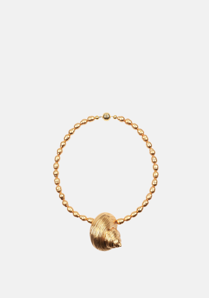 A statement that says “I found this on a glamorous beach.” Chunky gold beads and a sculpted shell that catches light (and compliments) from every angle.