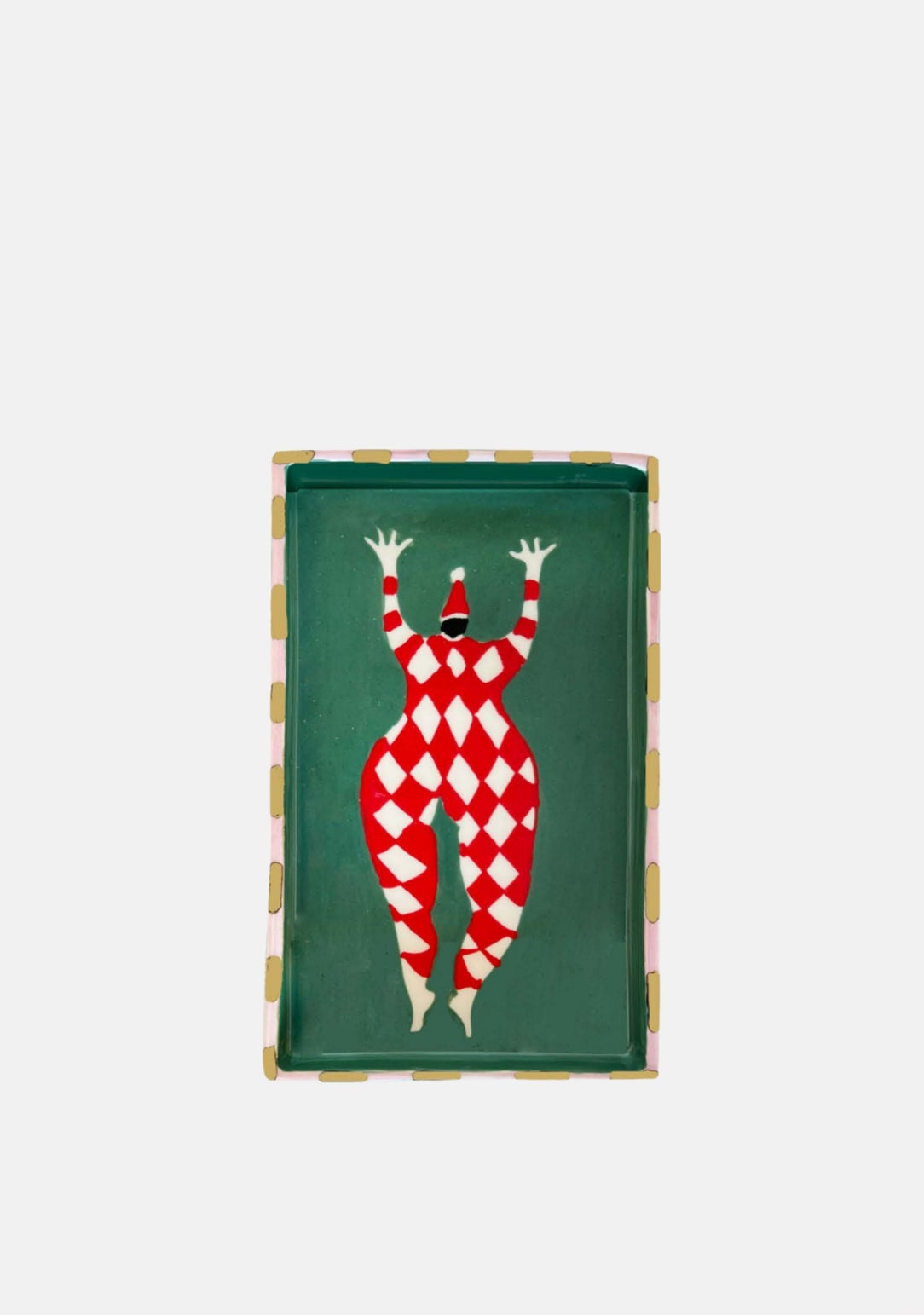This rectangular tray showcases a bold harlequin Santa in red and white against a deep green background. Hand-painted and full of character, it brings a striking visual element to seasonal dining or display.