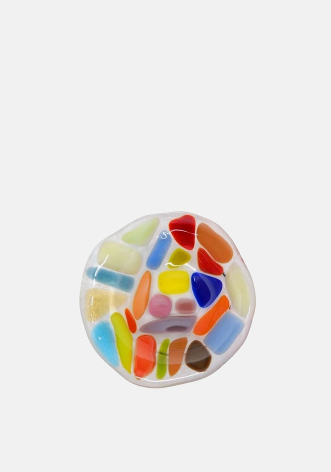 A small glass dish bursting with bold shapes and colors, this piece is as versatile as it is eye-catching. Use it as a snack plate, trinket holder, or a vibrant accent on your coffee table. Each dish is uniquely made with fused glass, meaning no two are alike. Practical yet playful, it’s the perfect piece for anyone who loves functional art.