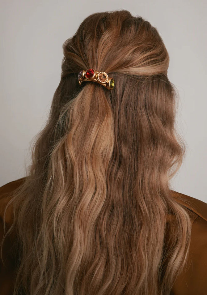 Add a playful pop of color with this 14k gold-plated Pony Cuff, adorned with sparkling multicolored crystals. Perfect for highlighting a bubble pony, braid, or half-up style, it instantly elevates any hairstyle with light-catching detail.