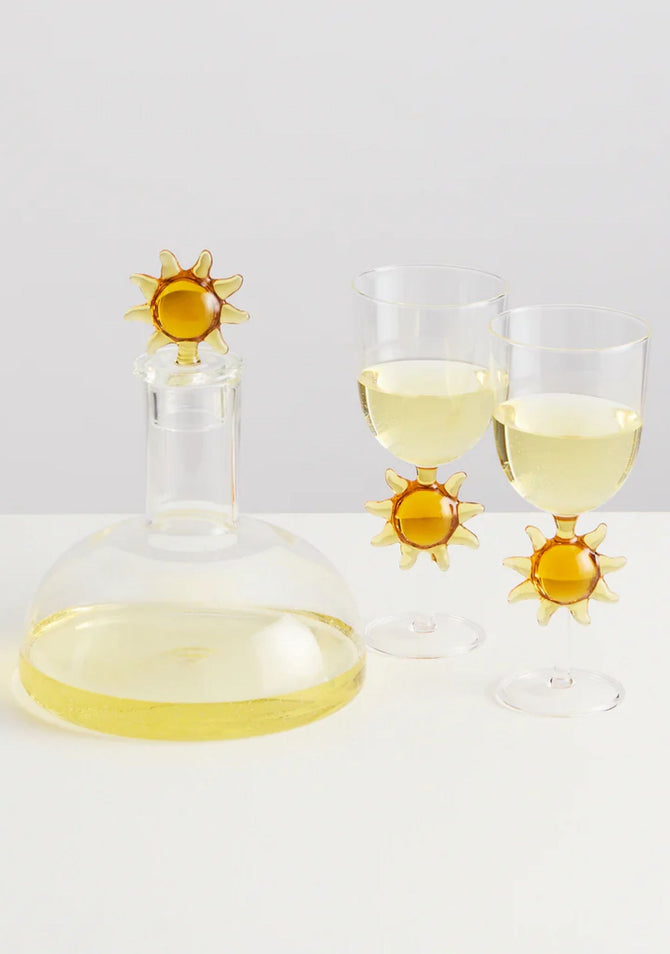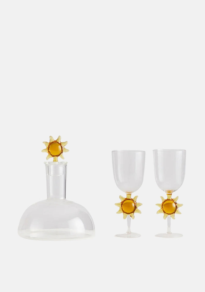 Created in collaboration with Spain’s Serge Castella Interiors, this striking set of wine glasses and matching decanter celebrates the warmth and joy of the Mediterranean, while paying homage to the radiant spirit of Salvador Dalí. Each glass is adorned with a glowing sun motif, echoing the decanter’s crowning sun detail, together forming a harmonious ensemble that brings light, artistry, and celebration to the table.