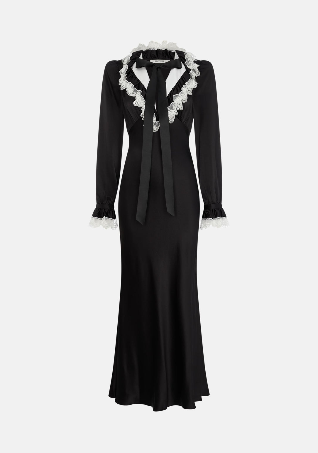 Infused with romance and a gothic edge, Rodarte's silk-collared lace-trimmed dress is one from fairytales. The monochrome colour palette, long blouson sleeves, bias-cut drape and ruffled edges are the perfect combination.