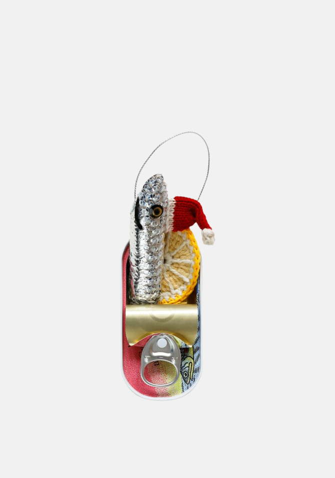 A knitted, hand-sequinned sardine dons a tiny, knitted Santa hat, nestled behind a crocheted slice of lemon - all presented in a recycled tin, ready to sparkle on your tree this Fishmas. Each ornament is individually signed on the reverse and produced in a limited edition of 100, making it a truly collectible piece of festive artistry.