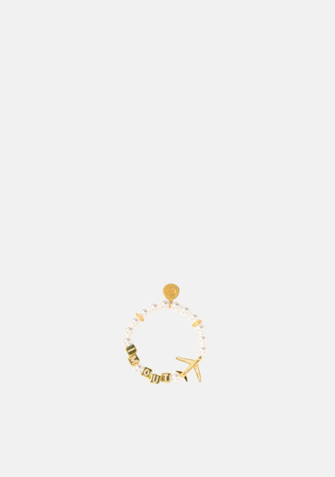 Ready for takeoff? This playful bracelet from Venessa Arizaga combines glossy pearls, gold letter beads and a chic airplane charm for the ultimate jet-set vibe. Whether you’re boarding a flight or just daydreaming about your next escape, it’s the perfect accessory for adventurers with style.