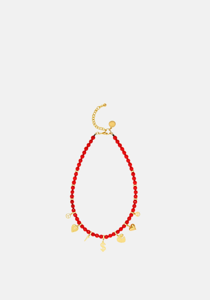 Turn heads with this bold red-beaded necklace from Venessa Arizaga, where passion meets play. Adorned with gleaming gold charms, hearts, dollar signs, and symbols of love, it’s a cheeky nod to romance and ambition. Perfect for adding a flirty, confident touch to any outfit.